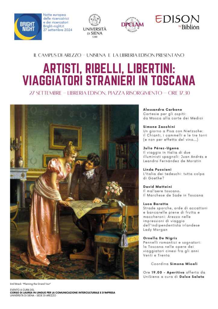 L’attività proposta prevede una staffetta di 5/6 mini-seminari (ca. 15/20 minuti l’uno) in cui verranno presentati libri, memorie, opere d’arte di artisti e letterati stranieri in viaggio in Italia (uno per ciascuna lingua del corso di laurea in “Lingue per gli studi interculturali e d’impresa”: francese, tedesco, russo, spagnolo, inglese e cinese). Particolare rilievo verrà dato al viaggio in Toscana in quanto regione tradizionalmente esclusa dai classici itinerari del Grand Tour sei-settecentesco, in modo da mettere in luce alcuni aspetti più in ombra del solidissimo legame tra storia letteraria e l’esperienza del viaggio. L’iniziativa si orienterà su un format agile e di interazione con il pubblico (Q&A, curiosità o quiz finali), e si svolgerà in collaborazione con la libreria aretina Edison libri, in piazza Risorgimento, attigua a Borsa Merci, situata in ottima posizione del centro città.